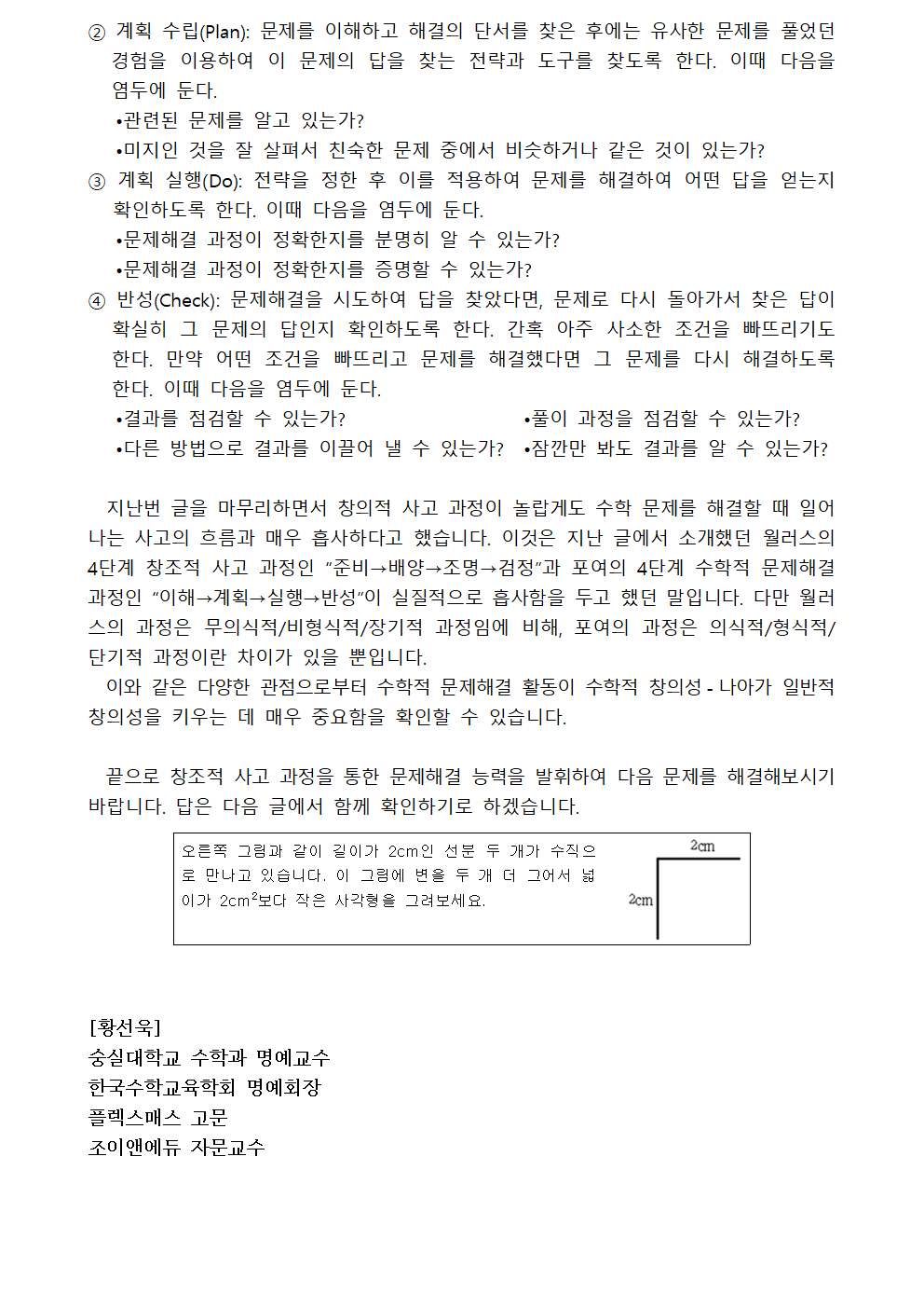[황선욱 명예교수 수학칼럼] 수학적 창의성과 문제해결