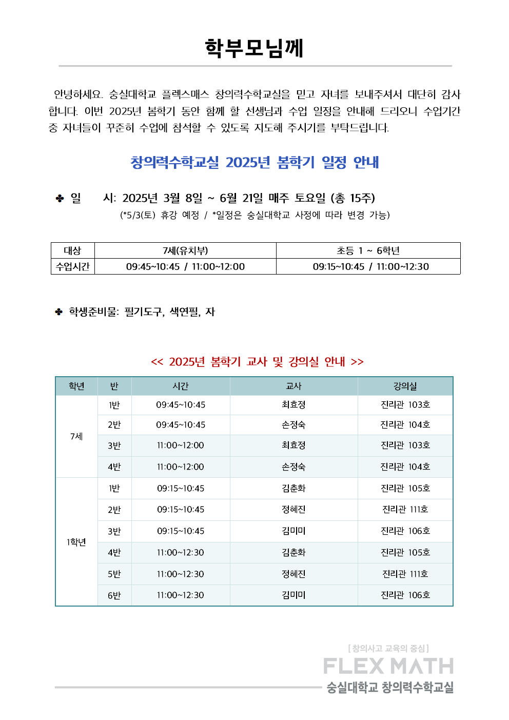 2025 봄학기 창의력수학교실 교사 및 강의실 안내