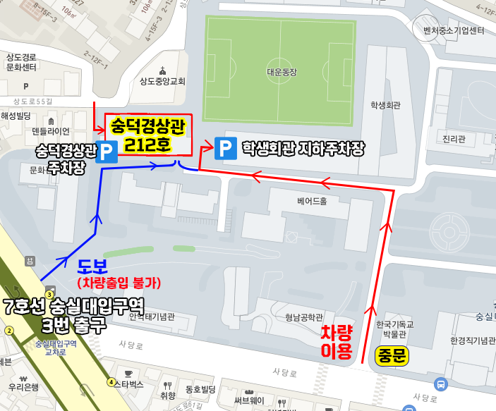 장승배기 → 상도동우체국 → 상도동성당 → 상도동사거리에서 750M 가량 직진 → 반대편 방향 롯데리아 앞 신호등에서 상도로53길 방면으로 좌회전 후 40M 직진 → GS25 편의점 앞 상도로37길 방면으로 우회전 후 80M 직진 → 상도로55길 방면으로 좌회전 후 90M 직진 → 숭실대학교 숭덕경상관 주차장