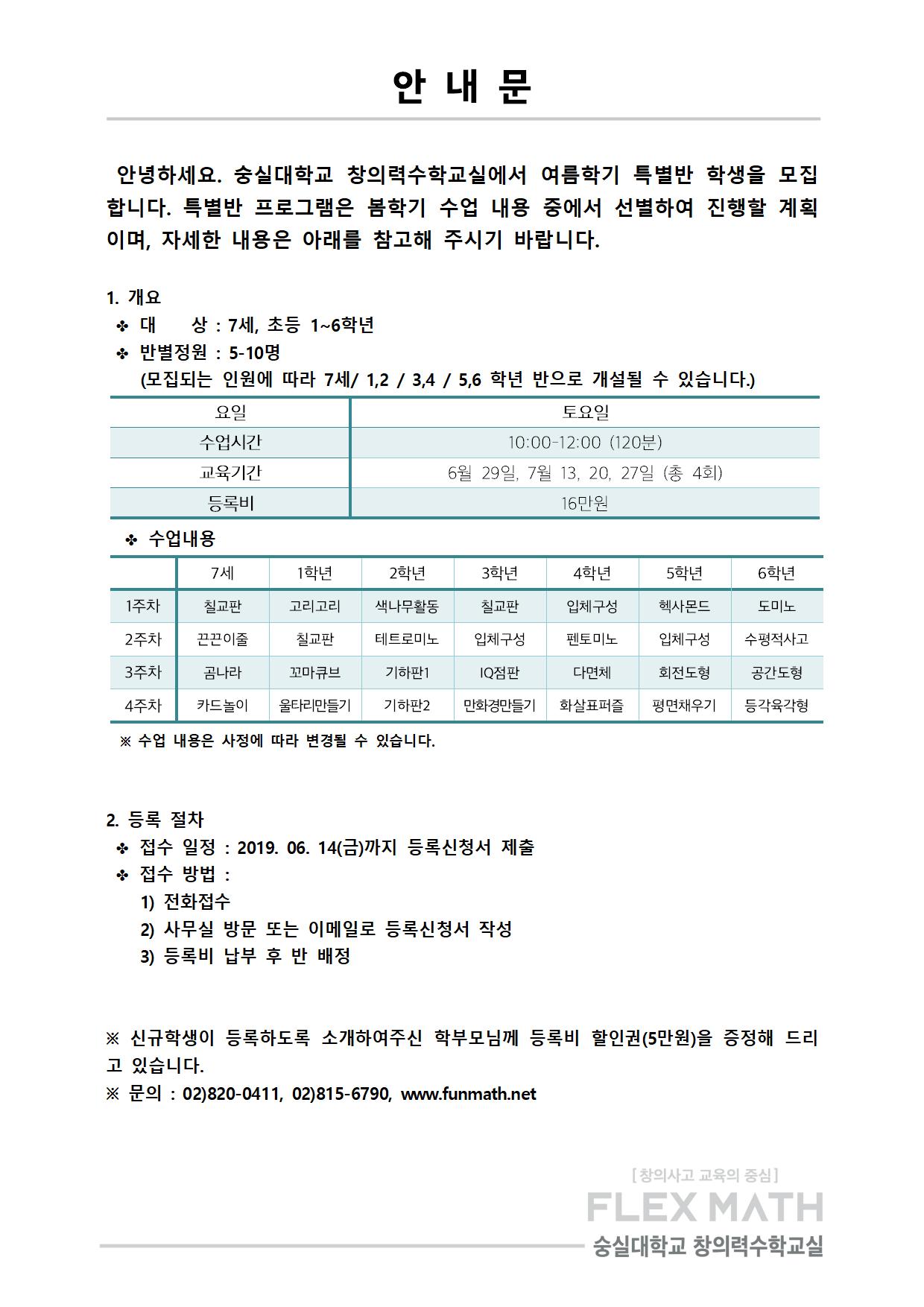 2019년도 여름학기 특별반을 다음과 같이 모집합니다.