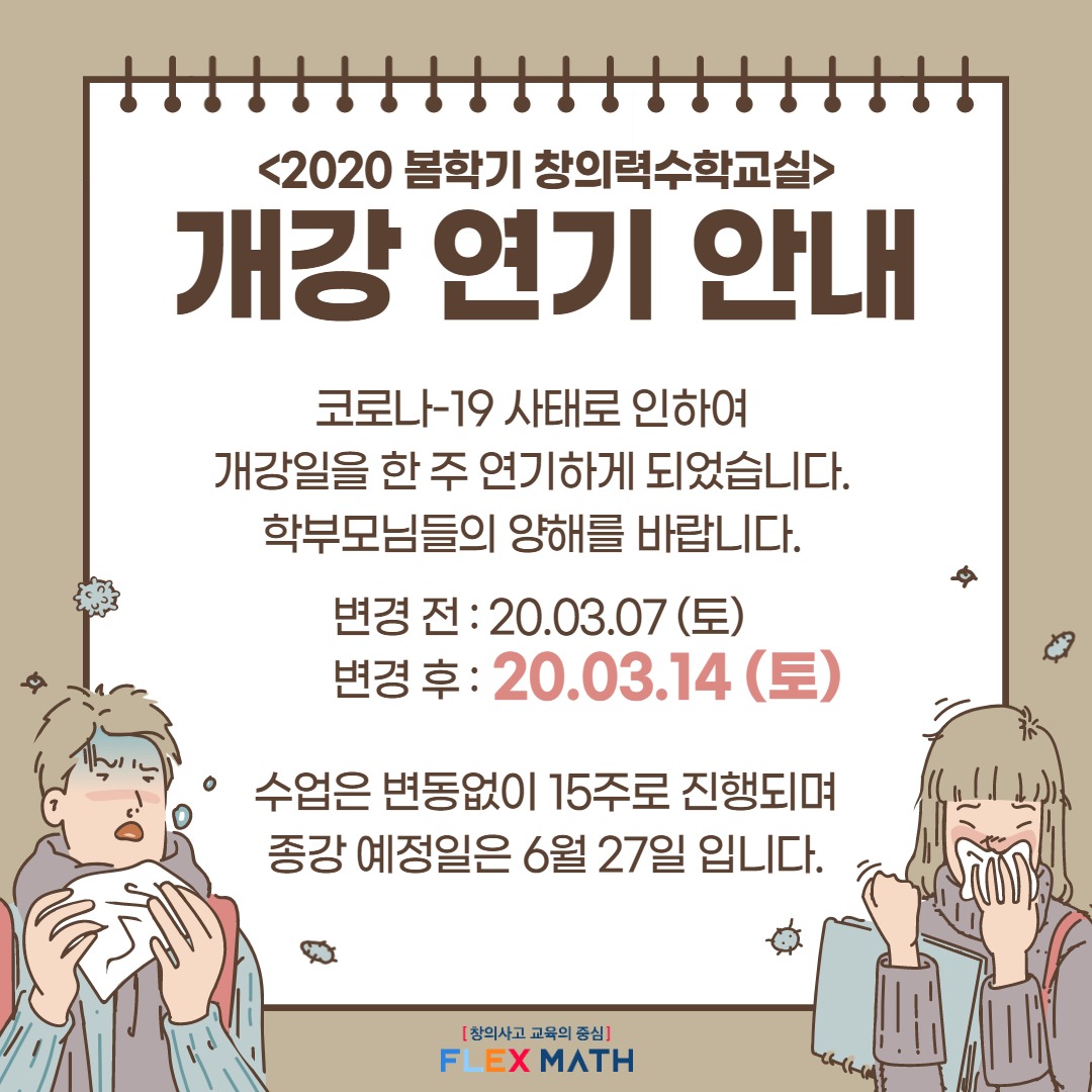 코로나-19 사태로 인하여 창의력수학교실 개강을 한 주 연기하게 되었습니다.