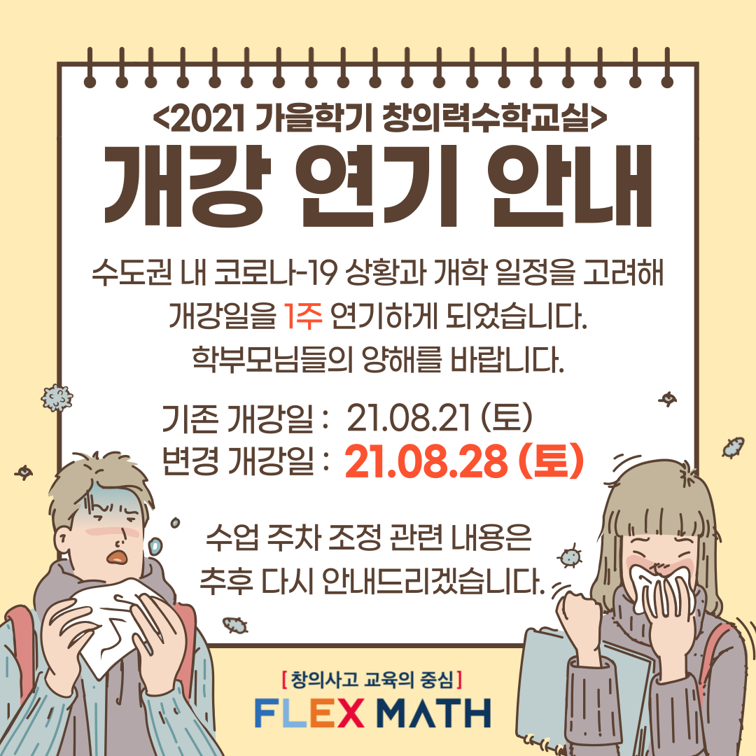 2021 가을학기 창의력수학교실 개강을 1주 연기하기로 결정했습니다.