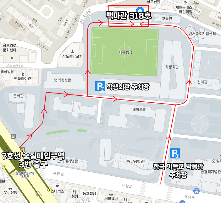 이수사거리 → 남성역 → 총신대 → 백운소방파출소 → 숭실대 남문에서 180M 가량 직진 → 숭실대 정문 → 한국기독교박물관