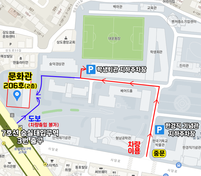 용산 → 한강대교 → 상도터널 → 상도사거리에서 좌회전 → 숭실대입구 → 삼거리에서 좌회전 후 220M 가량 직진 → 숭실대 중문(비보호좌회전) → 한국기독교박물관