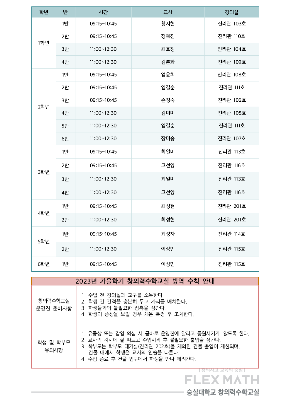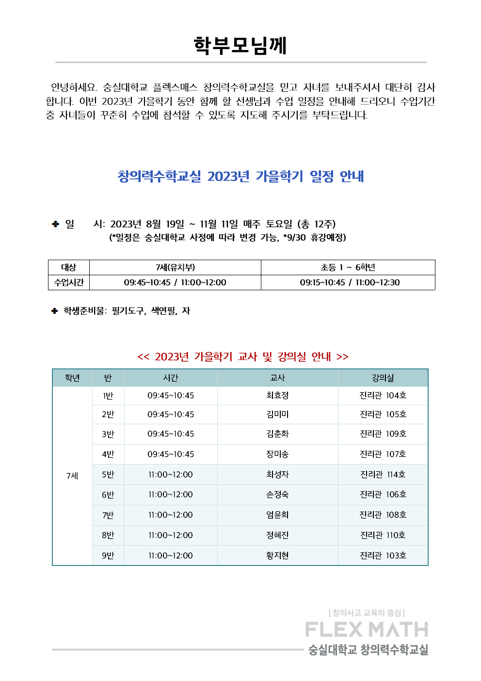 2023 가을학기 창의력수학교실 교사 및 강의실 안내