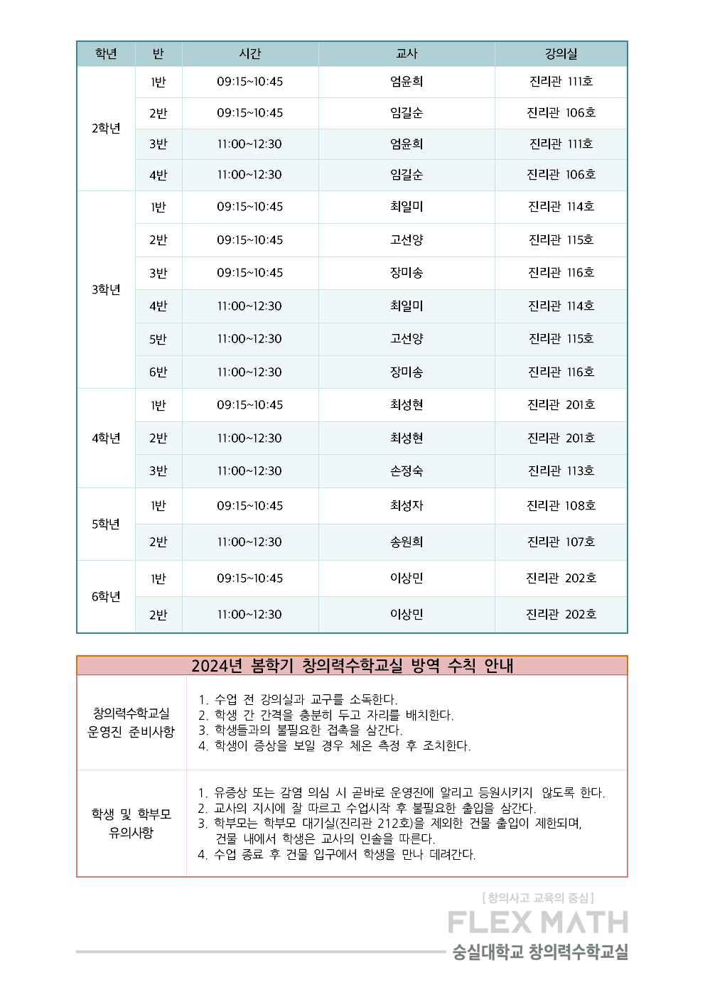 2024 봄학기 창의력수학교실 교사 및 강의실 안내