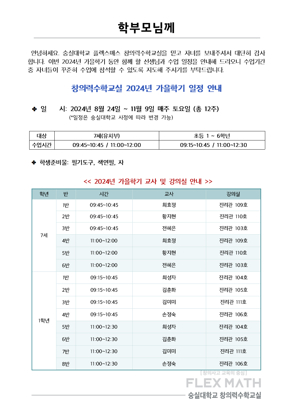 2024 가을학기 창의력수학교실 교사 및 강의실 안내
