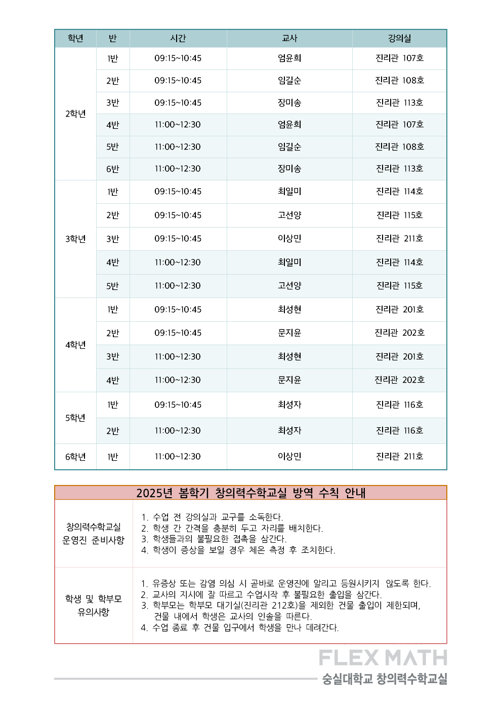 2025 봄학기 창의력수학교실 교사 및 강의실 안내