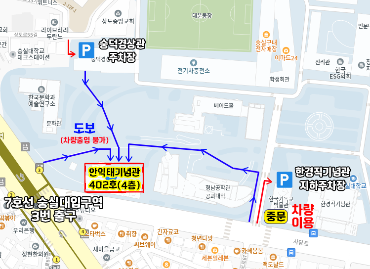 장승배기 → 상도동우체국 → 상도동성당 → 상도동사거리에서 750M 가량 직진 → 반대편 방향 롯데리아 앞 신호등에서 상도로53길 방면으로 좌회전 후 40M 직진 → GS25 편의점 앞 상도로37길 방면으로 우회전 후 80M 직진 → 상도로55길 방면으로 좌회전 후 90M 직진 → 숭실대학교 숭덕경상관 주차장