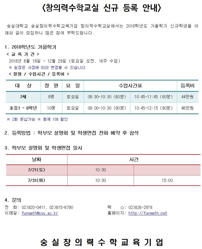 2018학년도 가을학기 창의력수학교실 신규 학생 등록 안내